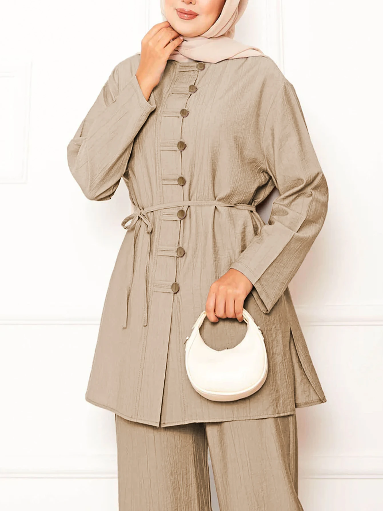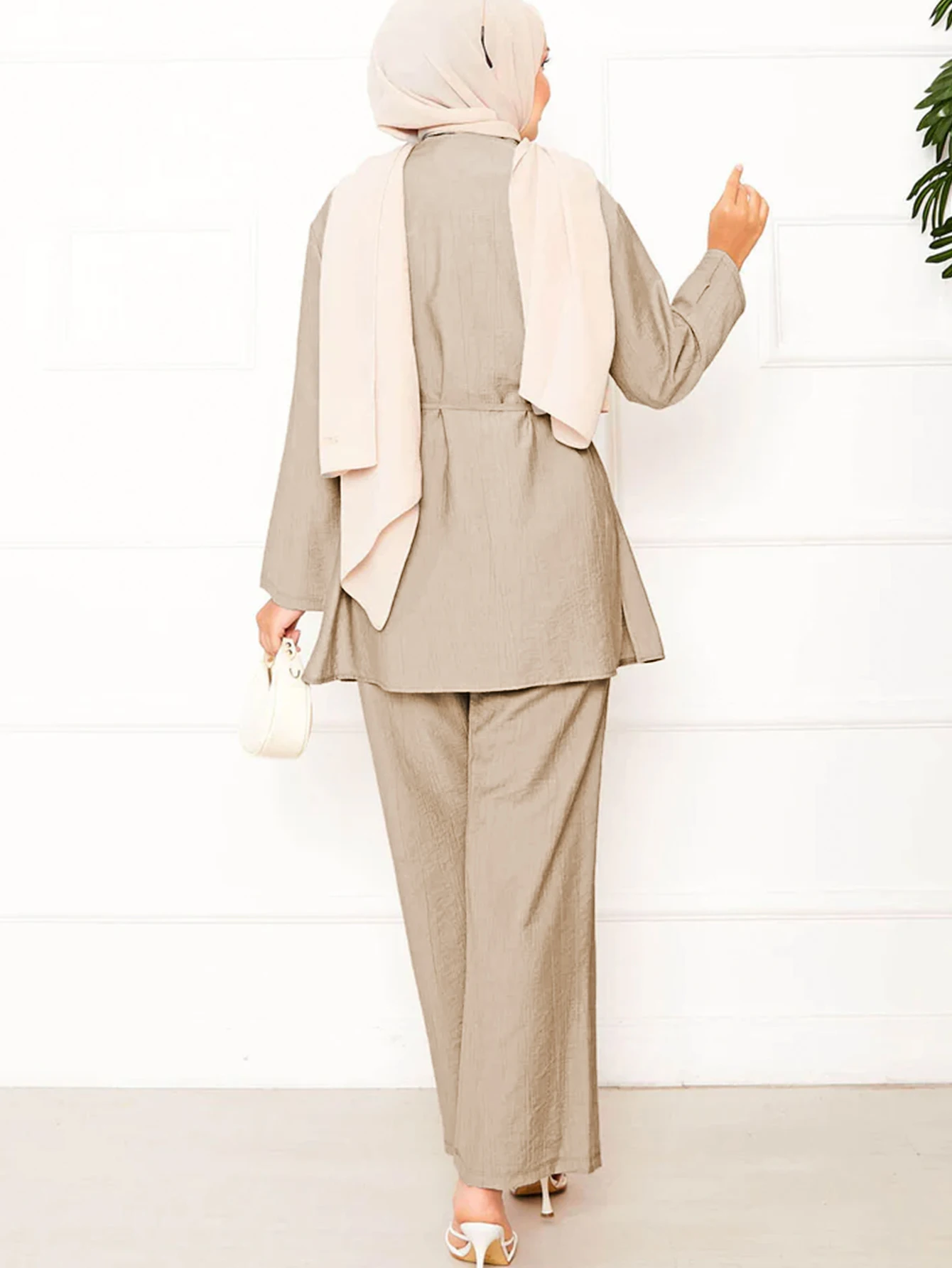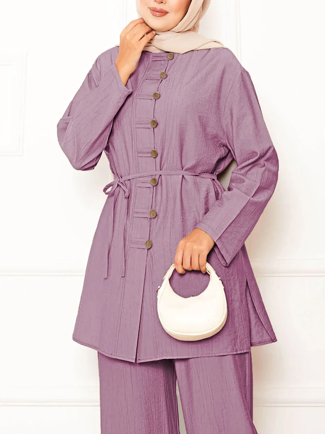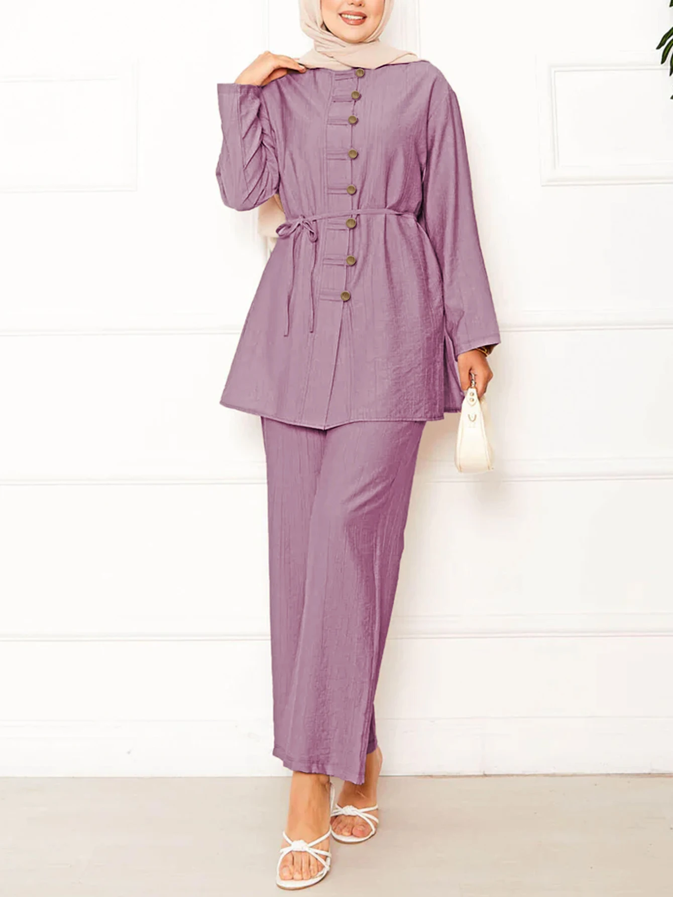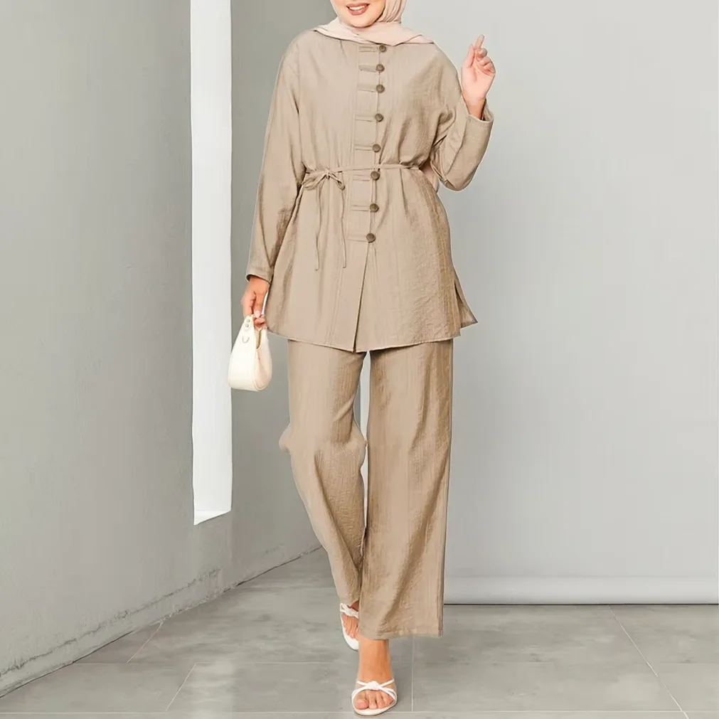 Bulk Modest Ladies Elegant Muslim Clothes Middle East Dubai Two Piece Suit Turkish Long Sleeve Shirt Blouse Pants Suit for Women
